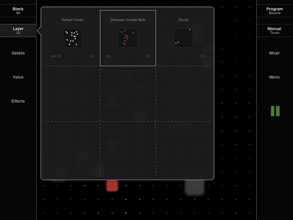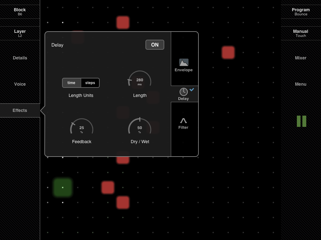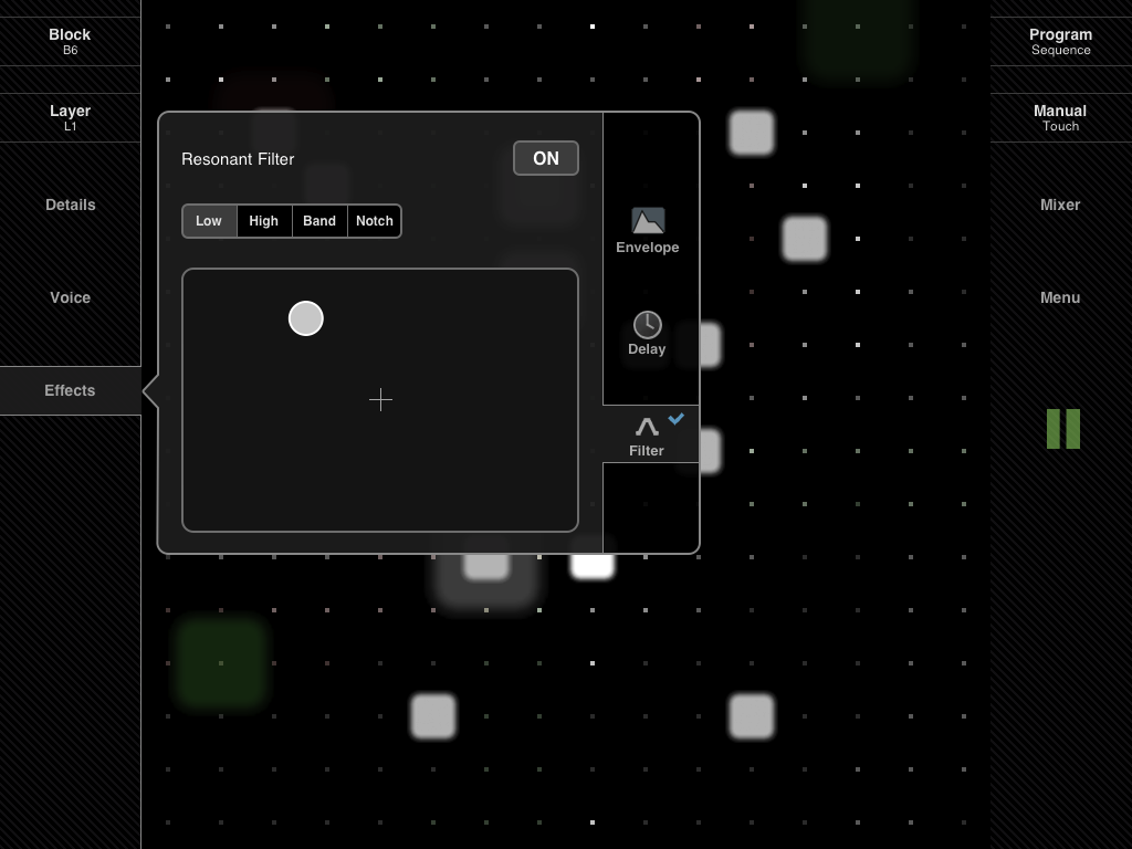 Separate sound effects for each layer: amp envelope, delay and resonant filter (lowpass, highpass, bandpass and notch).