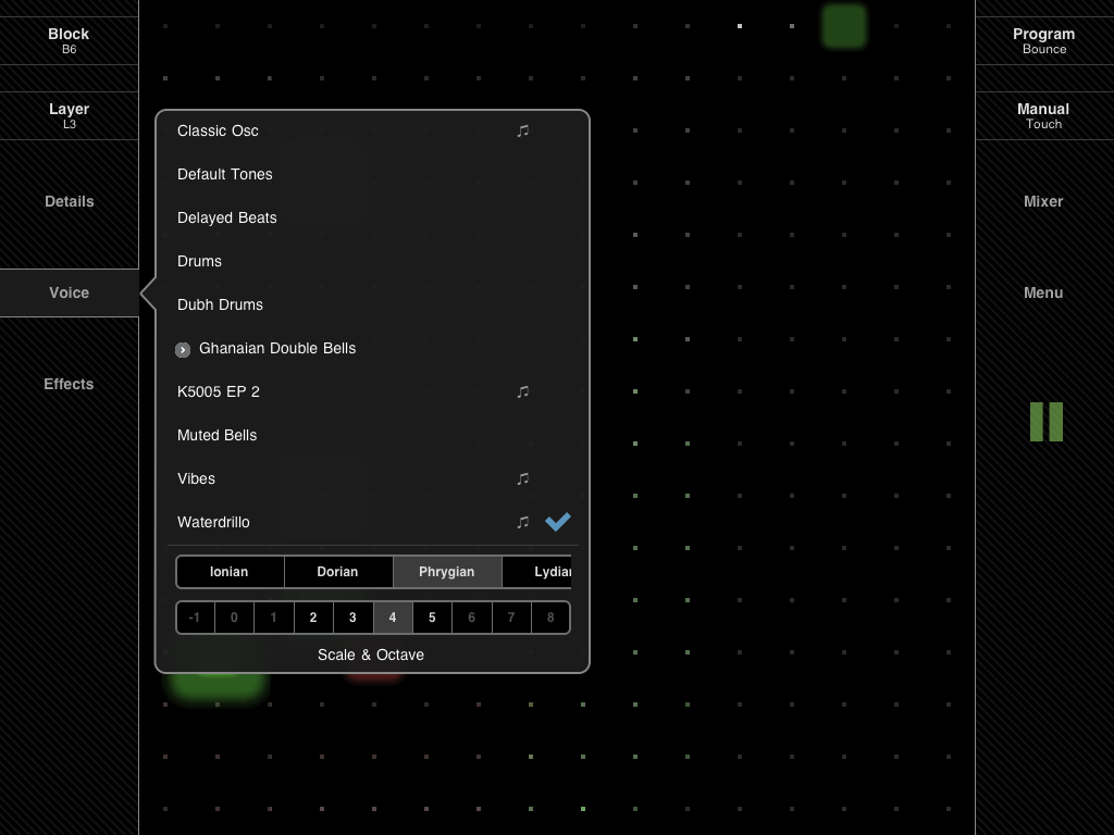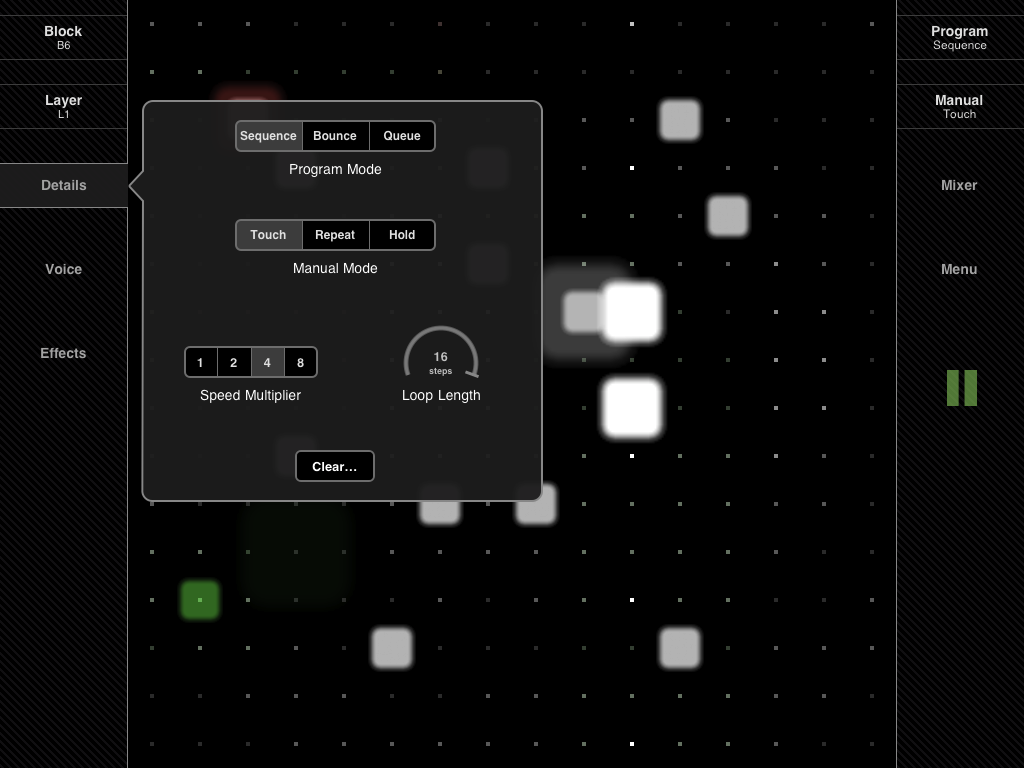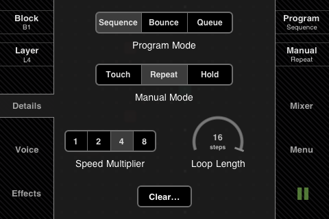 Up to nine 16x16 matrix layers, 16 blocks grouping patterns across all layers. Six different performance modes: Sequence, Bounce, Queue (program modes), and Touch, Repeat, Hold (manual modes).