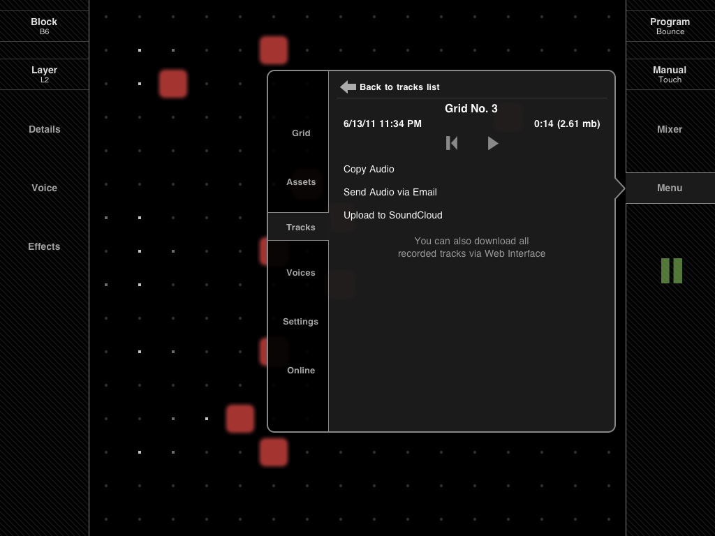 Record your performances and export in uncompressed WAV format, send via email, upload directly to SoundCloud or copy to clipboard for further processing in other applications.
